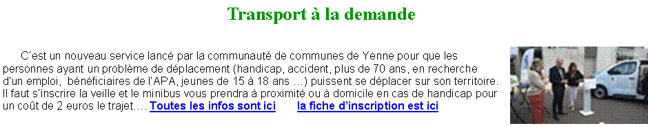 C’est un nouveau service lancé par la communauté de communes de Yenne pour que les personnes ayant un problème de déplacement (handicap, accident, plus de 70 ans, en recherche d’un emploi, bénéficiaires de l’APA, jeunes de 15 à 18 ans …) puissent se déplacer sur son territoire. Il faut s’inscrire la veille et le minibus vous prendra à proximité ou à domicile en cas de handicap pour un coût de 2 euros le trajet…. Toutes les infos sont ici la fiche d’inscription est ici |