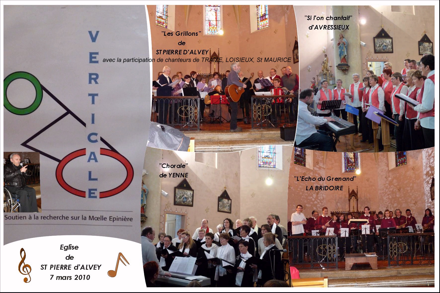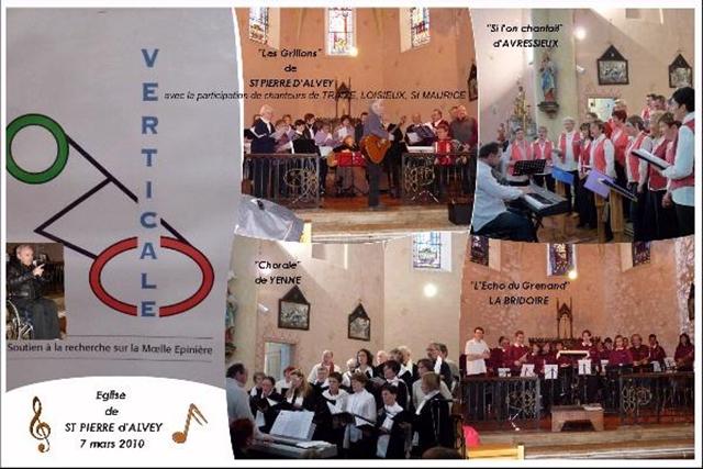 Le 7 mars 2010, un grand concert était donné en l’église de St Pierre d’Alvey, au profit de l’association VERTICALE, organisé par SPA avec la participation de quatre ensembles musicaux |