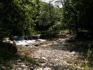 Depuis sa source, il poursuit son cours en longeant Mure, puis descend par une ravine boisée entre Gerbaix et le Carrel, vers le creux de la vallée. A cet endroit, il entaille profondément les collines d’un ravin qui marque la limite sud de notre commune. Il sépare aussi les cantons de Yenne et de St Genix. Son lit est discret, et son cours capricieux: tantôt fougueux, à chaque crue il ronge et effondre ses berges, comme ci-contre en crue à Ameysin. Tantôt paisible, il offre aux pêcheurs ses trous d’eau moussus, et même parfois, plus d’eau du tout! |
